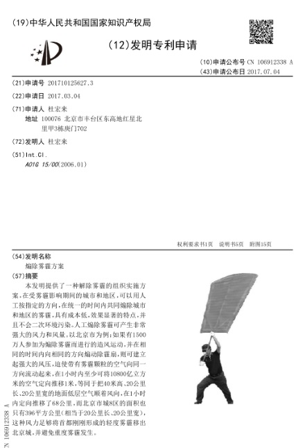 大陸一名發明家針對霧霾的問題,提出一個發明概念的「搧除霧霾方案」專利申請案,該專利申請內容指出人們可以大量聚集搧風,藉此產生極大的風量,共同搧除霧霾,有著低成本、高效果的優點,不會造成二次汙染,自誇是個「一兼二顧,摸蜊仔兼洗褲」的好辦法。