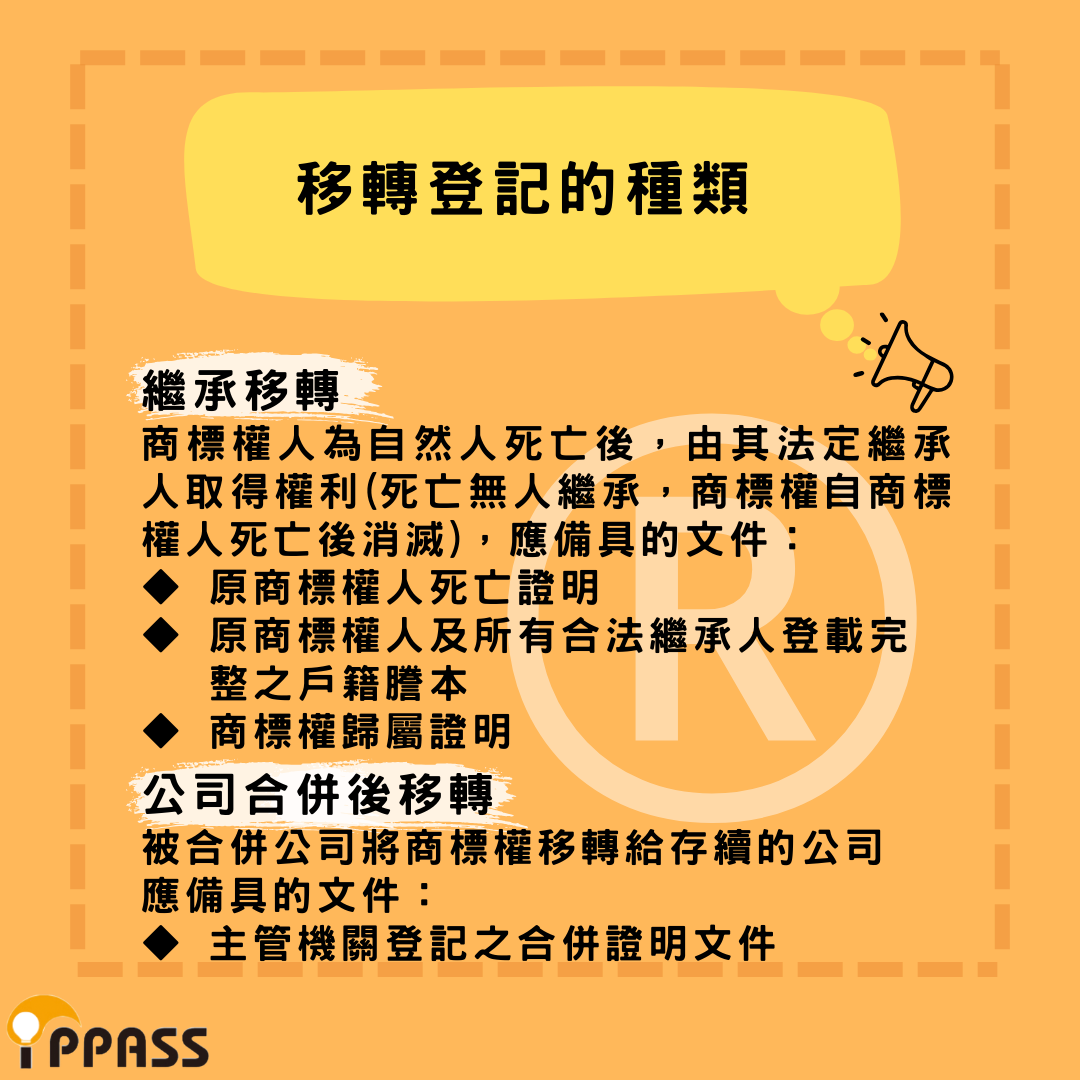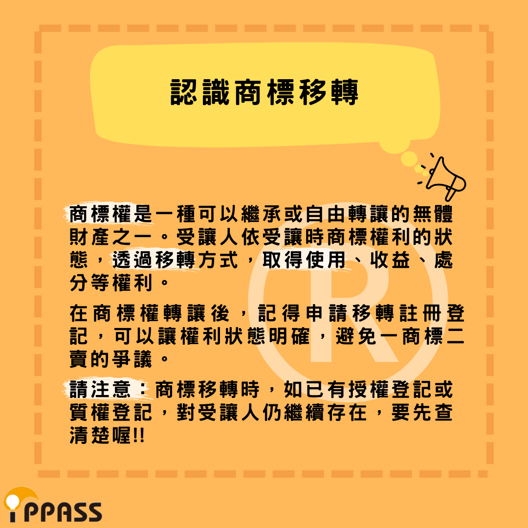 注意:商標移轉時,如已有授權登記或質權登記,對受讓人仍繼續存在。